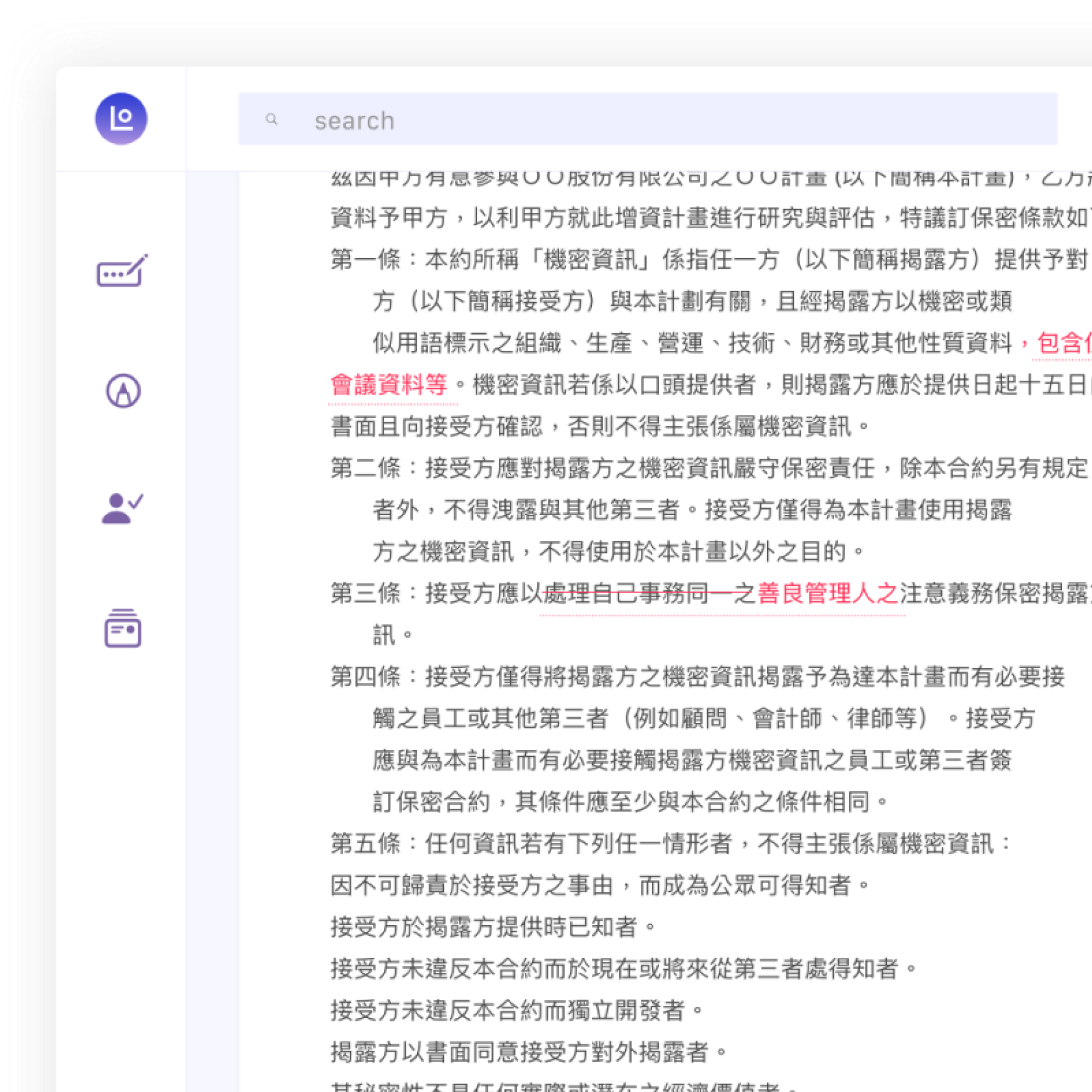 透過 AI 依據自定義審閱標準,自動分析契約內容,精準辨識潛在風險條文、矛盾內容與合規缺失,快速完成初步審閱,降低法務人力負擔。