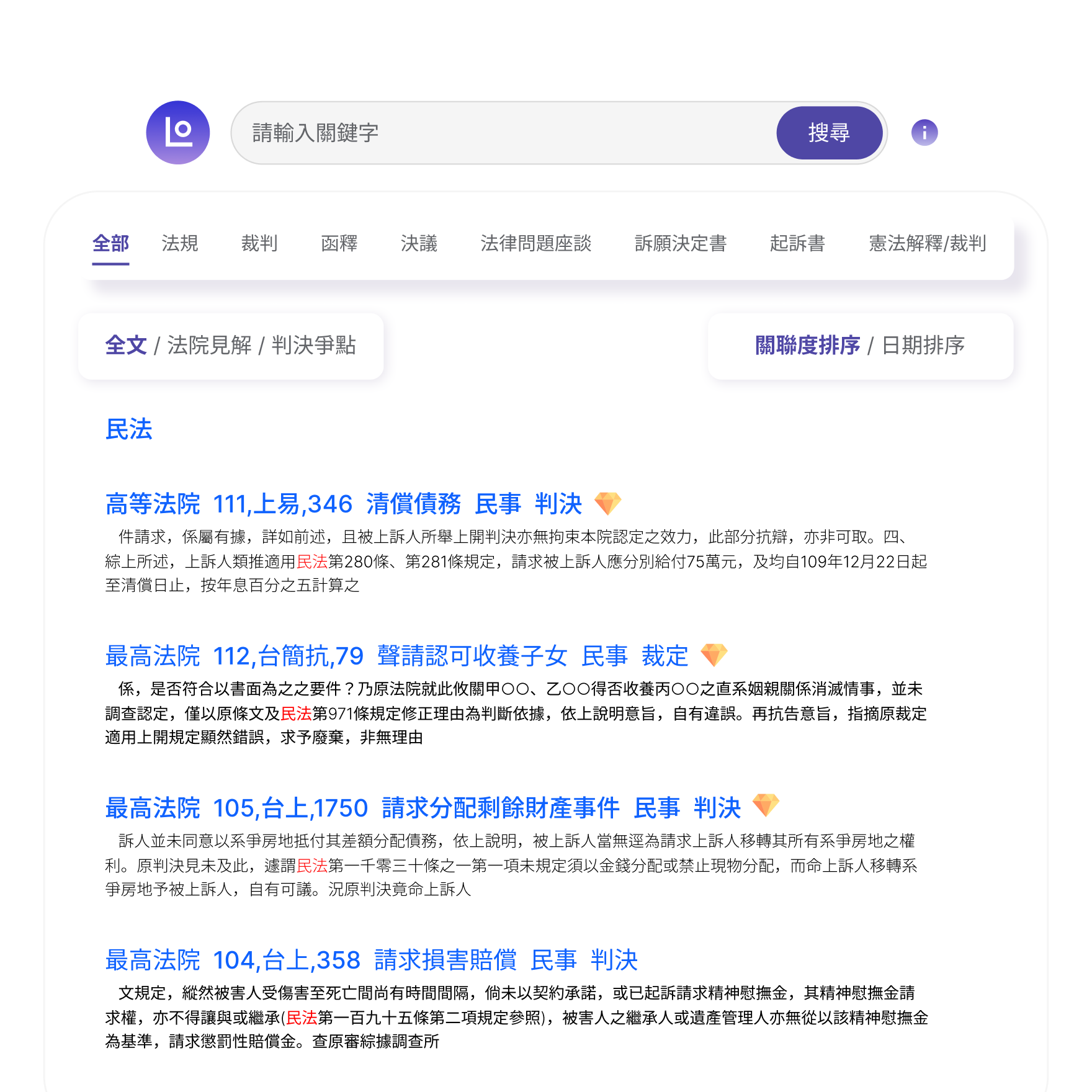 • 瀏覽裁判、法規、函釋等各類法學資料。